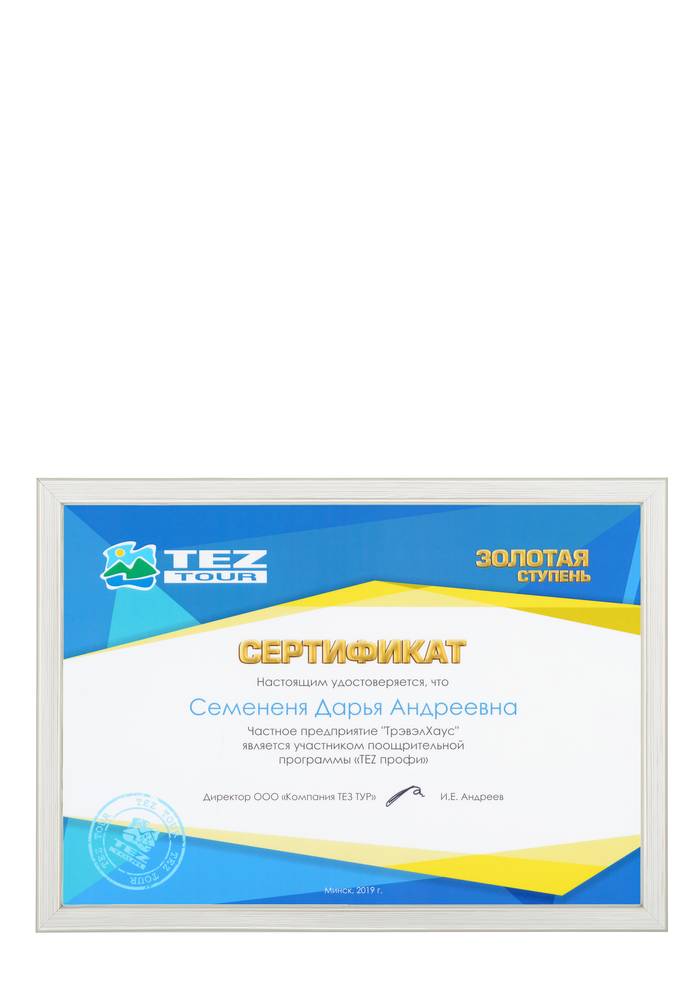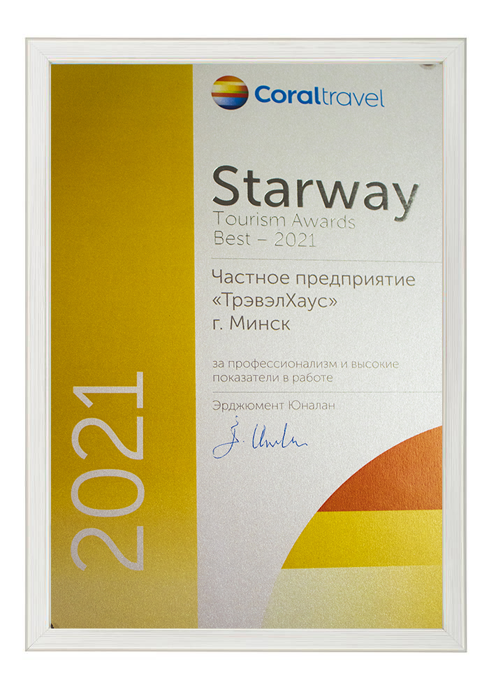 Сертификат соответствия № BY/112 04.03. 071.01 00109 выдан ГУ «Национальное агентство по туризму» Министерства спорта и туризма Республики Беларусь. Компания Travel House прошла добровольную сертификацию услуг. Ежегодно аудиторы ГУ «Национальное агентство по туризму» проверяют офисы продаж, уровень квалификации специалистов компании, внутреннюю документацию, договоры оказания туристических услуг, стандарты работы и подтверждают соответствие услуг компании актуальным требованиям Закона о туризме и другому законодательству Республики Беларусь.